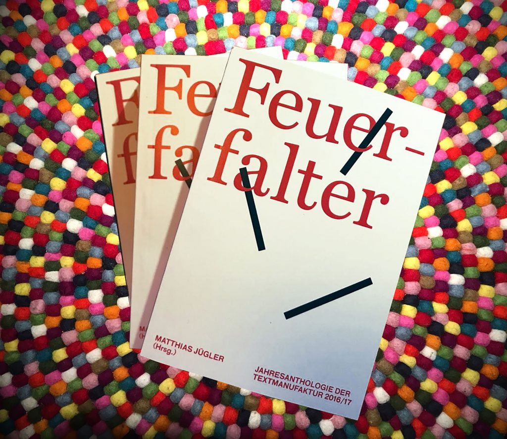 Jedes Jahr wählen die Lektoren und Dozenten der Textmanufaktur die besten, gewagtesten, vielversprechendsten Texte aus und publizieren sie in einer Anthologie. Gerade ist die 6. Anthologie, erschienen – und ich bin dabei! Danke an Matthias Juegler und André Hille, dass ihr aus unseren Texten ein Buch gemacht habt.
