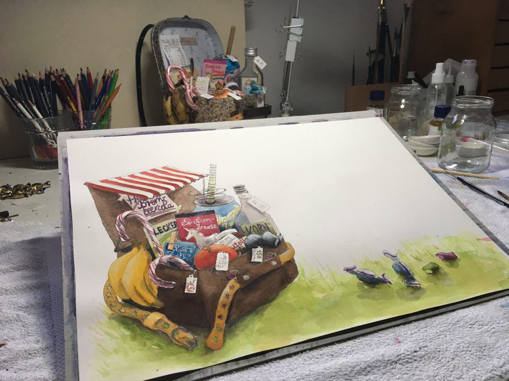 Eine neue Illustration entsteht: Ein Bauchladen wie im Märchen war der Auftrag. Diesmal habe ich mir ein Modell gebaut, ich hätte mir die Sachen zwar alle auch ausdenken können, aber das Basteln hat Spaß gemacht. Die Fotos unten zeigen ein Detail der Vorzeichnung und das Bild im Drucklayout.
